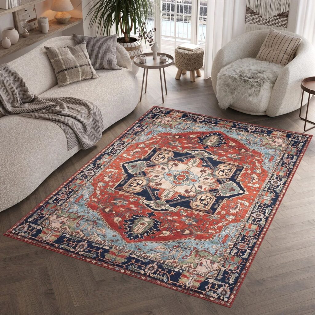 Podobnie jak dywan Filadelfia 7291, ten model ma klasyczny, orientalny wzór z symetrycznym medalionem i misternymi detalami roślinnymi oraz geometrycznymi. Jednak w odróżnieniu od stonowanego 7291, tu królują intensywne, ciepłe kolory. W porównaniu do surowego dywanu Filadelfia 7294, jest bardziej tradycyjny i pełen życia.