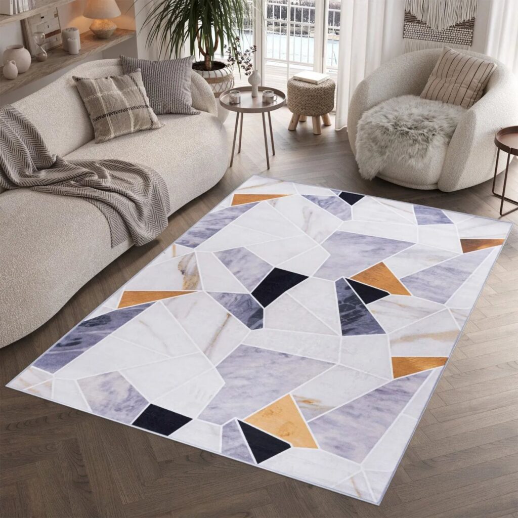Ostatnim modelem w naszym zestawieniu jest dywan Filadelfia 7286, który łączy minimalizm z wyrafinowaniem. Głównym kolorem jest jasny, kremowy odcień z subtelnymi żyłkami w tonach szarości i błękitu, przypominającymi fakturę marmuru. Geometryczne akcenty w postaci czarnych trójkątów i złotych elementów dodają nowoczesnego kontrastu.