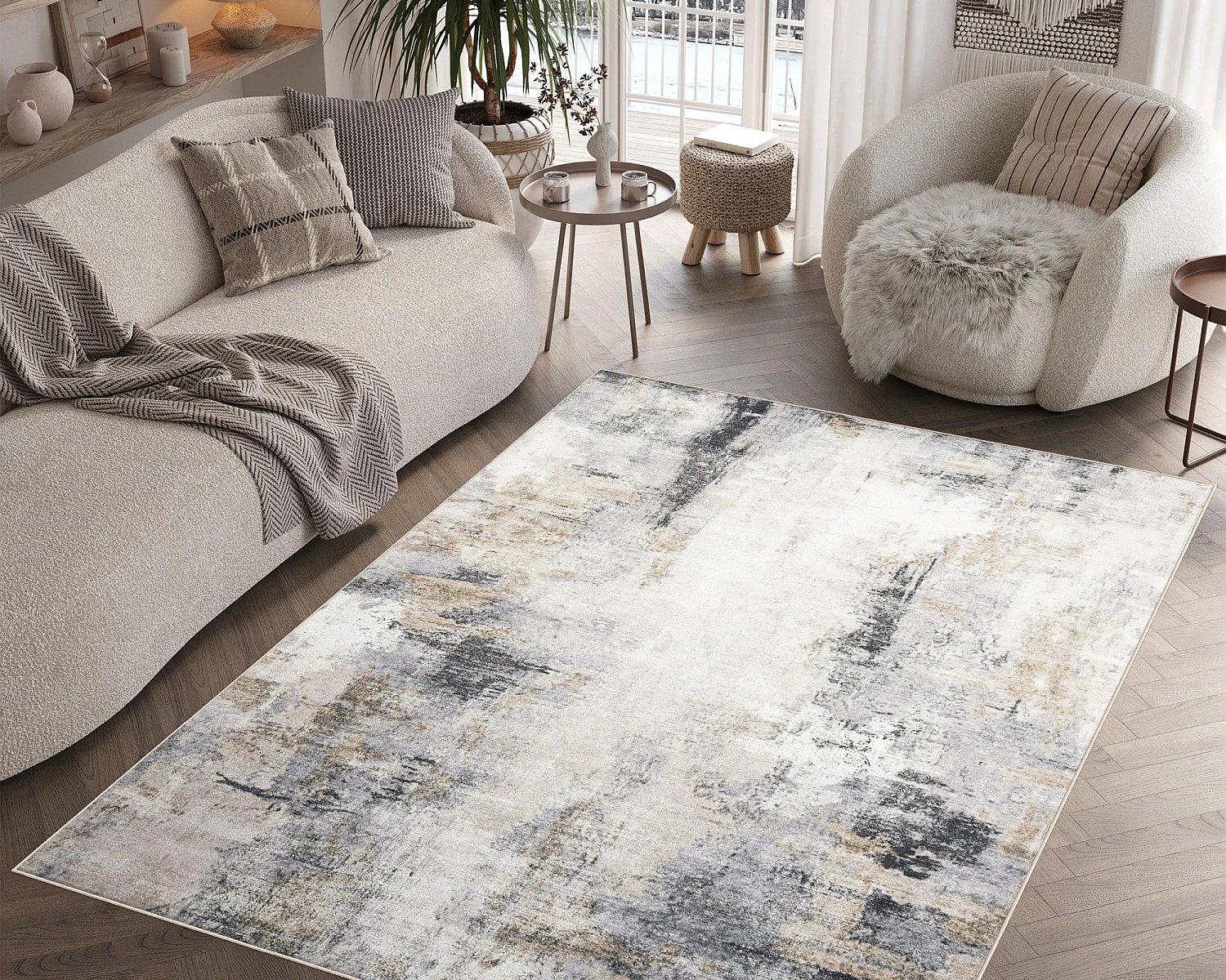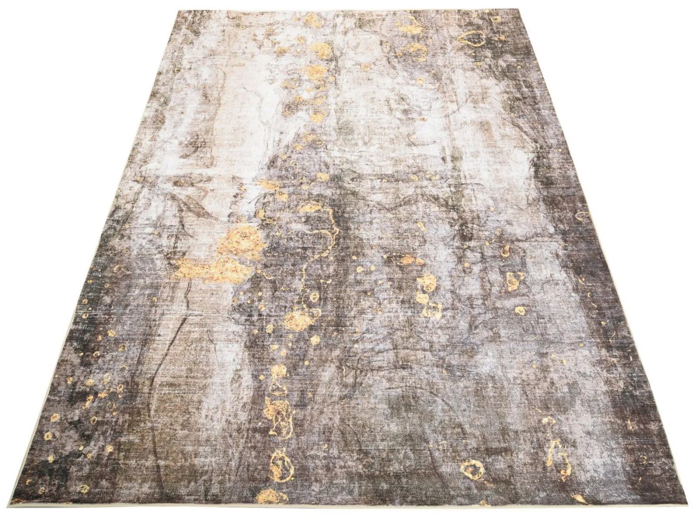 Kolejnym modelem, który przyciąga uwagę, jest dywan Filadelfia 7294. Ten dywan zachwyca surowym, a zarazem wyrafinowanym designem. Głównym kolorem jest głęboki, przytłumiony odcień szarości, który płynnie przechodzi w kremowe i beżowe tony, przypominając postarzaną, marmurową powierzchnię. Delikatne plamy złota i brązu dodają mu luksusowego charakteru, niczym krople złota na antycznej posadzce.