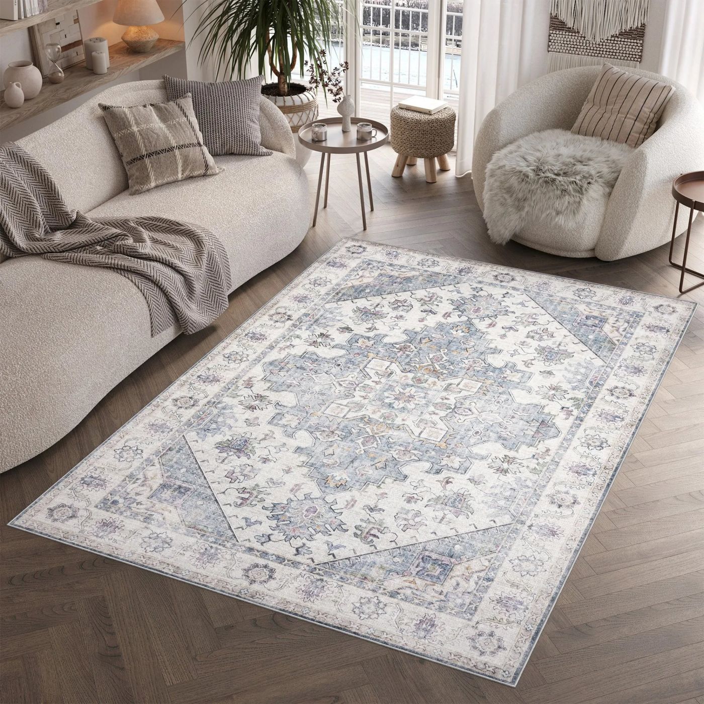 Pierwszym dywanem, który warto poznać, jest dywan Filadelfia 7291. Ten antypoślizgowy dywan wyróżnia się wyrafinowanym designem i delikatną paletą barw. Dominuje tu przytłumiony odcień niebieskiego, harmonijnie przeplatany kremową bielą. Pastelowe akcenty różu, szarości i beżu dodają mu głębi, tworząc efekt subtelnej patyny – jakby skrywał w sobie historie minionych epok.