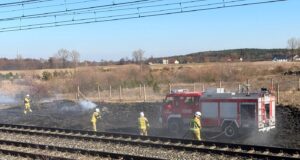 Pożar traw przy torach w Wymysłowie