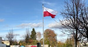 Maszt z biało-czerwoną flagą na placu Moraczewskiego