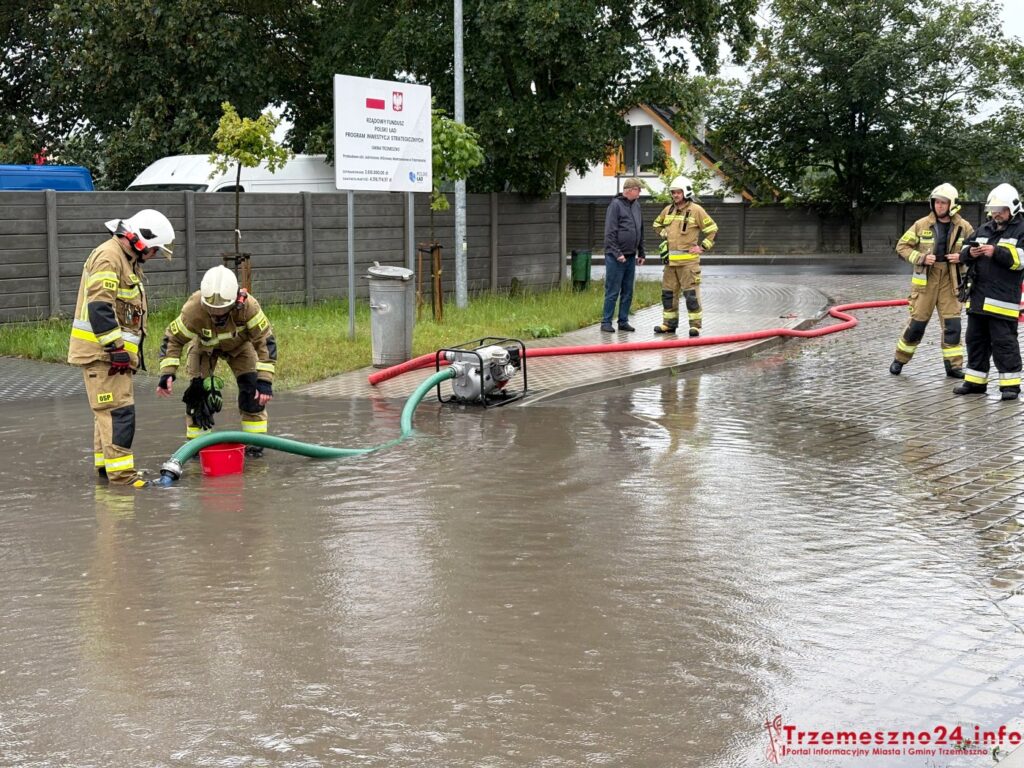 Strażacy z OSP w Trzemesznie interweniowali wczoraj przy zalanej piwnicy na ulicy Dworcowej, ale także przy wypompowywaniu wody z ulicy Jaśminowej. Ulica ta przeszła gruntowny remont w minionych latach. Posiada zainstalowane tzw. „studnie chłonne”, które – jak widać – nie sprawdzają się przy tak dużych opadach.