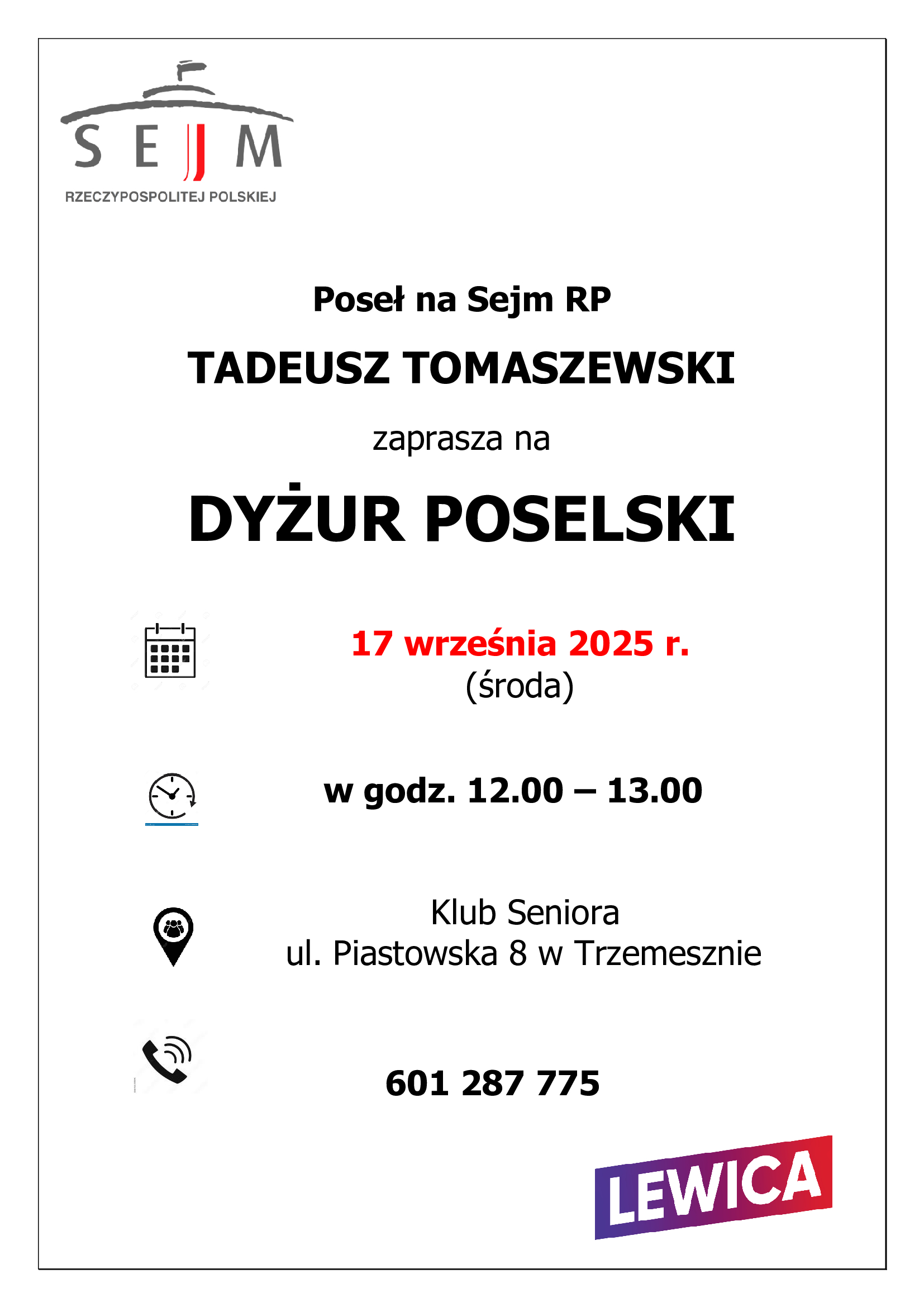 Poseł na Sejm RP Tadeusz Tomaszewski (Lewica) zaprasza mieszkańców Trzemeszna i gminy na dyżur poselski.