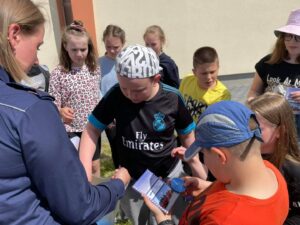 Policjanci nie tylko egzaminowali, ale też udzielali porad dotyczących bezpiecznego poruszania się rowerem i właściwego przygotowania się do jazdy. Rozmawiając z uczniami prosili ich, aby przestrzegali przepisów, ale też zwracali uwagę na prawidłowe wyposażenie rowerów, jazdę w kaskach ochronnych i elementach odblaskowych.