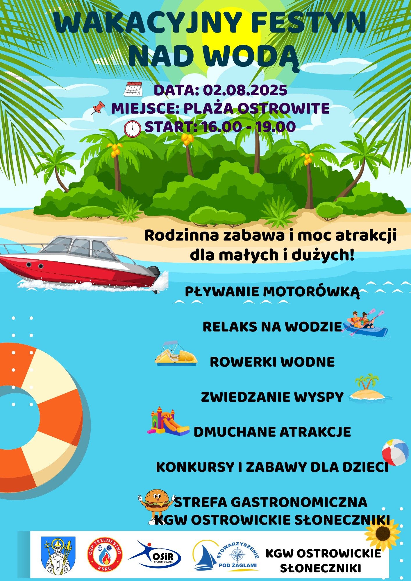 W programie między innymi pływanie motorówką, relaks nad wodą, rowerki wodne, zwiedzanie wyspy na jeziorze, dmuchane atrakcje oraz konkursy i zabawy dla dzieci.