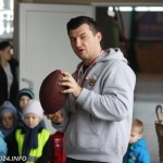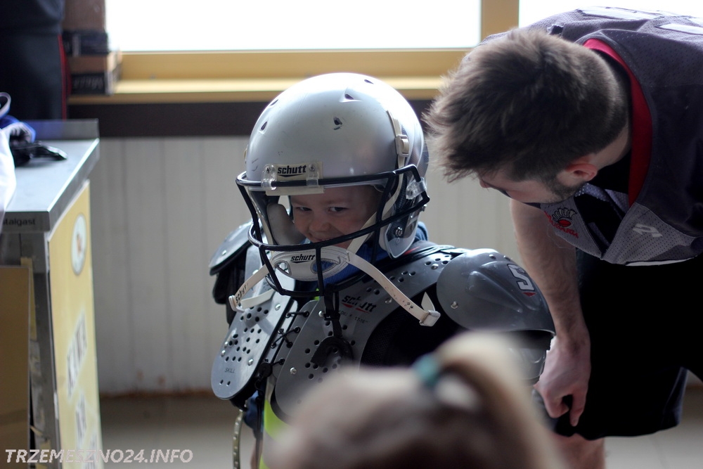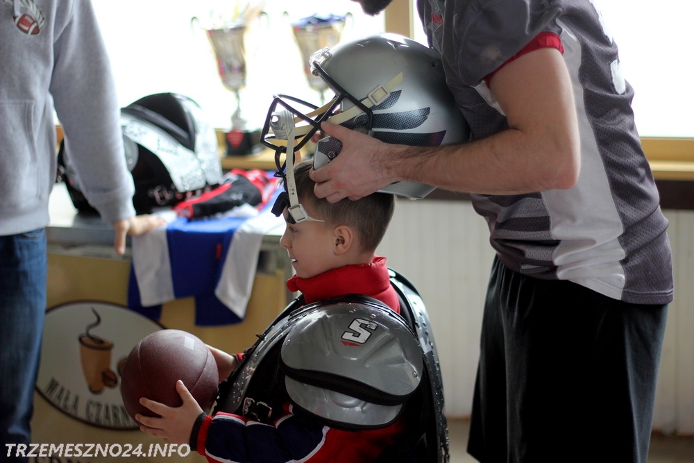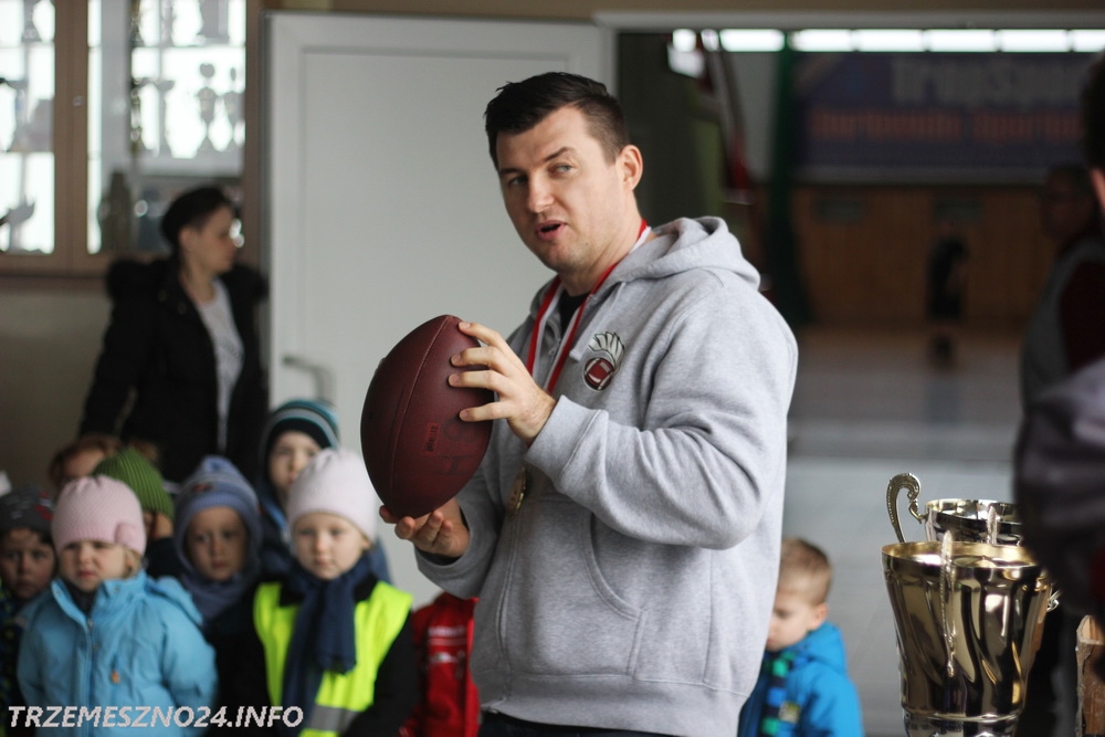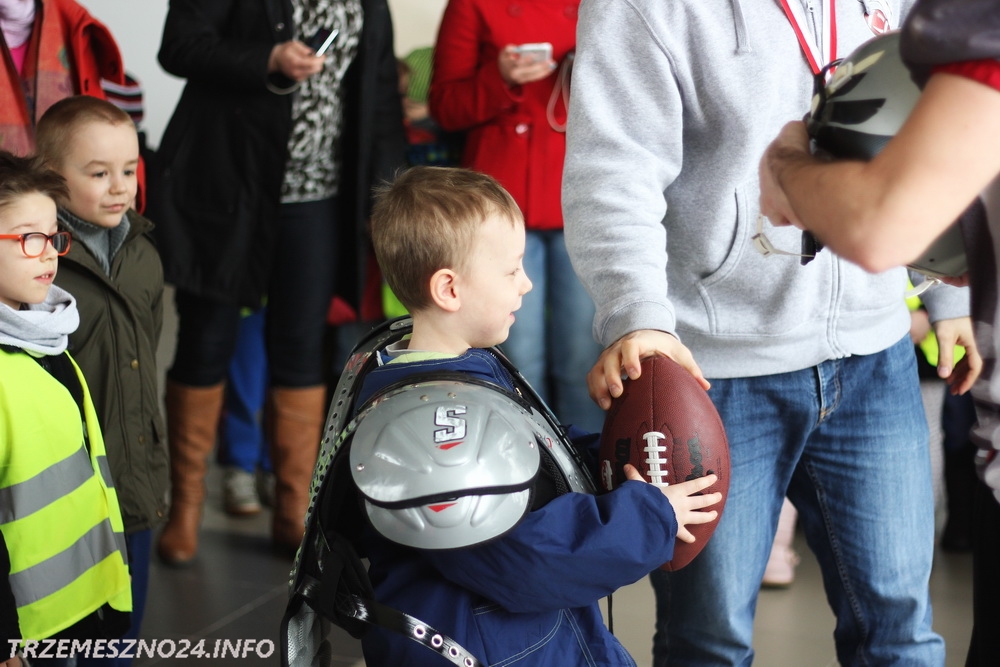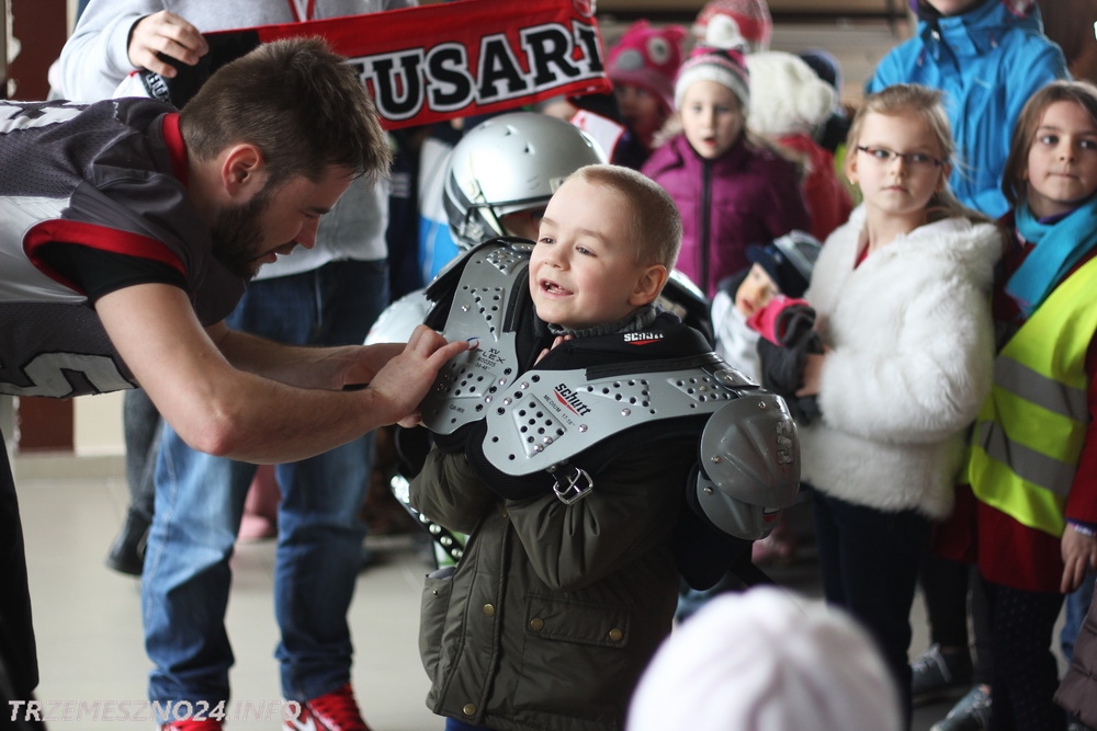 Zawodnicy drużyny futbolu amerykańskiego „Husaria Szczecin”, którzy od poniedziałku przebywają w naszym mieście na obozie sportowym, spotkali się dzisiaj z przedszkolakami z Przedszkola nr 2 im. Misia Uszatka w Trzemesznie. Gracze „Topligi” opowiedzieli o swoim sporcie, przeprowadzili profesjonalną rozgrzewkę oraz pozwolili wszystkim maluchom przymierzyć strój sportowy.