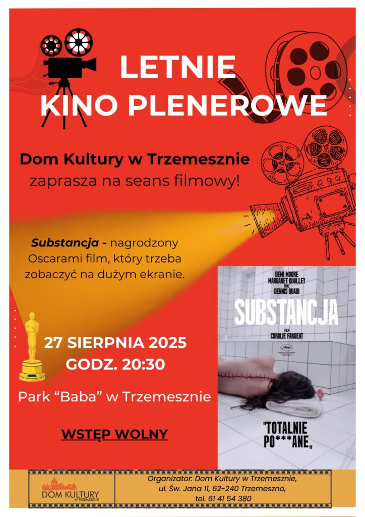 Dom Kultury w Trzemesznie zaprasza na seans filmu „Substancja” (pogranicze thrillera psychologicznego, horroru i satyry społecznej), który zostanie wyemitowany w kinie plenerowym w parku „Baba”, już w kolejną środę (27 sierpnia).