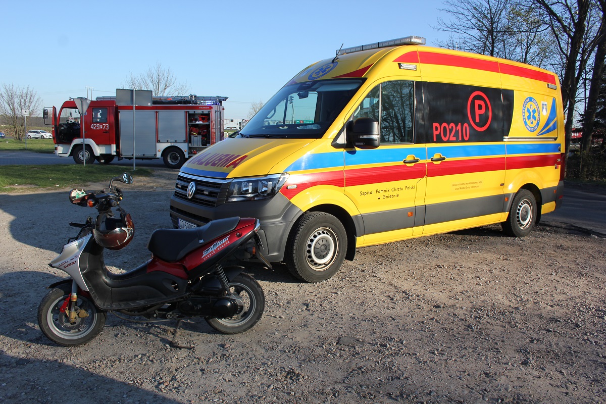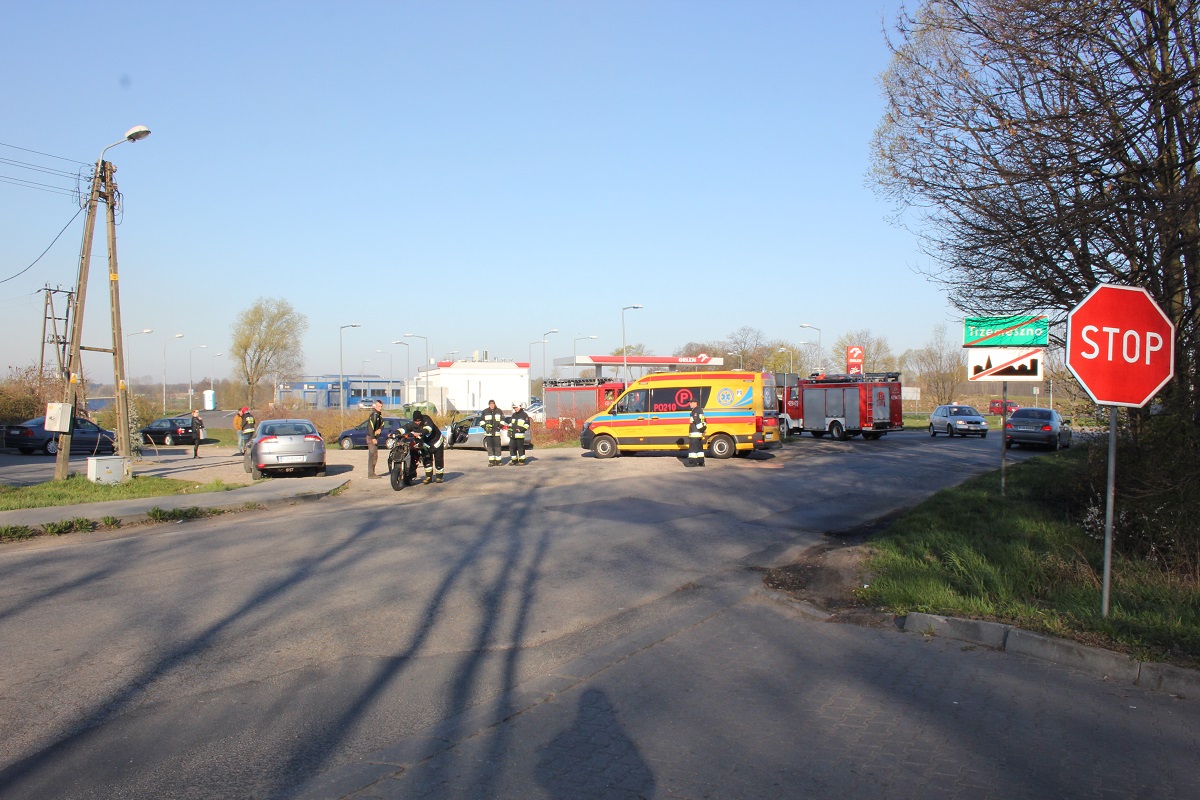 Kierujący BMW wyjeżdżający spod sklepu spożywczego (obok stacji Orlen) nie ustąpił pierwszeństwa jadącemu skuterem. W wyniku zdarzenia niegroźnych obrażeń ciała doznał kierujący jednośladem. Został przebadany przez załogę pogotowia ratunkowego, nie wymagał hospitalizacji.