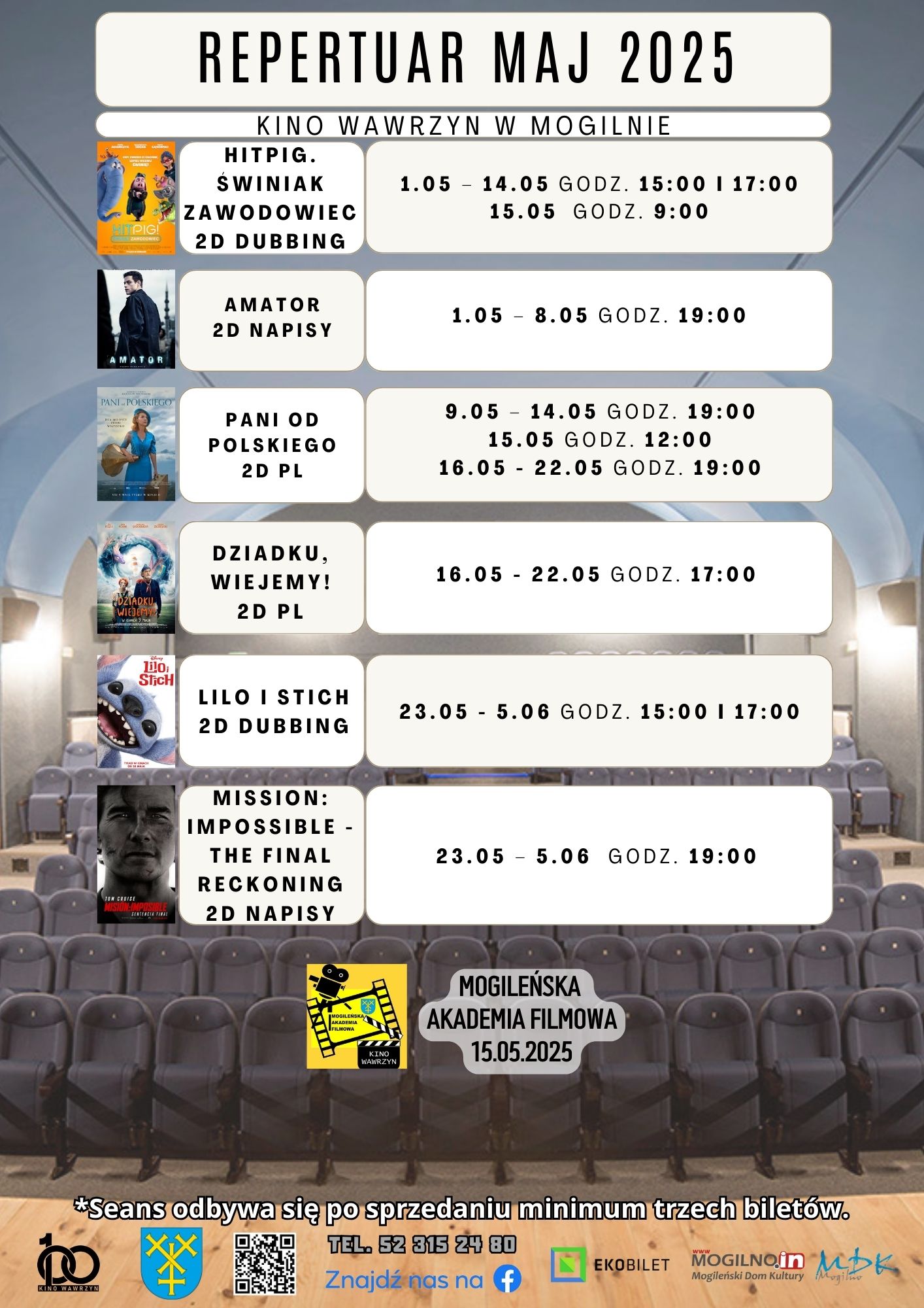 Bilety dostępne w kasie kina oraz na ekobilet.pl/mdk-mogilno, rezerwacje wyłącznie telefonicznie.