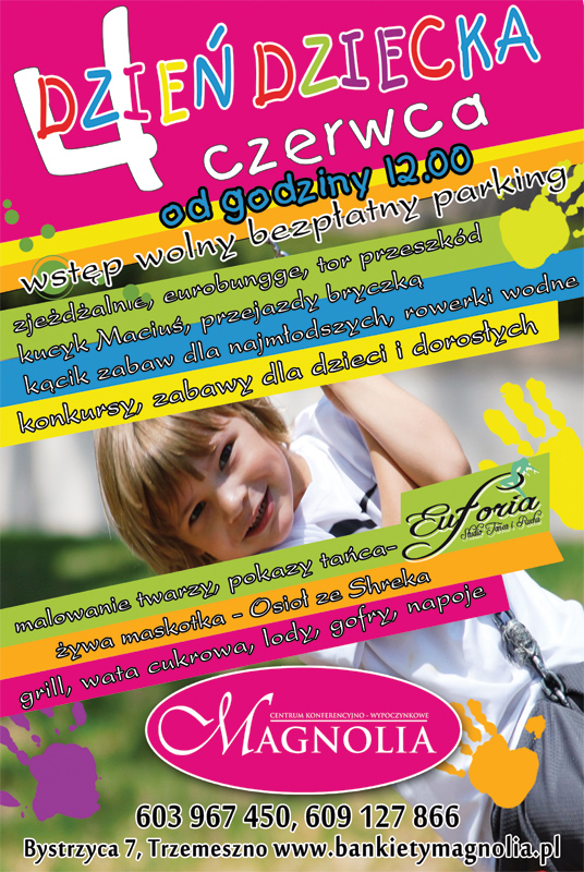 4 czerwca o godzinie 12:00 w Centrum Konferencyjno – Wypoczynkowym „Magnolia” rozpocznie się piknik rodzinny z okazji Dnia Dziecka. Wśród atrakcji zjeżdżalnie, zamki dmuchane, trampoliny, malowanie twarzy, kącik dla najmłodszych. Atrakcje wodne – rowerki i kajaki.