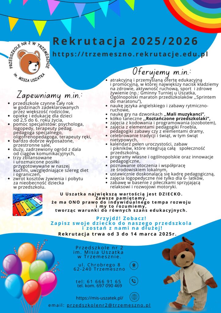 Już 3 marca (w poniedziałek) rusza nabór do Przedszkola nr 2 im. Misia Uszatka w Trzemesznie na rok szkolny 2025/2026. Potrwa on do 14 marca.