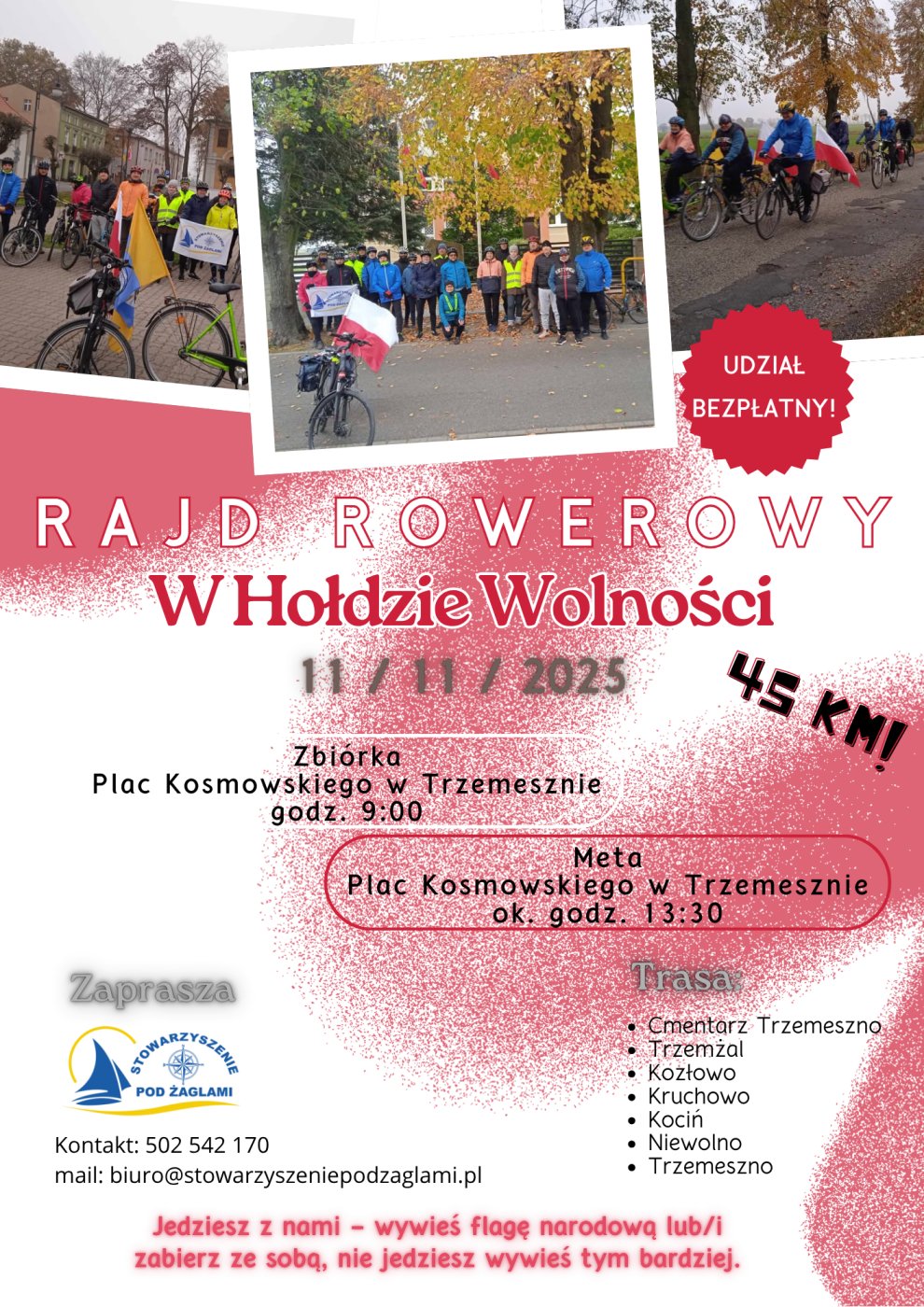 Start przewidziano na godzinę 9:00 z placu Kosmowskiego w Trzemesznie. Trasa liczy około 45 kilometrów i poprowadzi przez Cmentarz Parafialny w Trzemesznie, Trzemżal, Kozłowo, Kruchowo, Kociń, Niewolno, a następnie z powrotem do Trzemeszna. Zakończenie planowane jest około godz. 13:30 na placu Kosmowskiego.