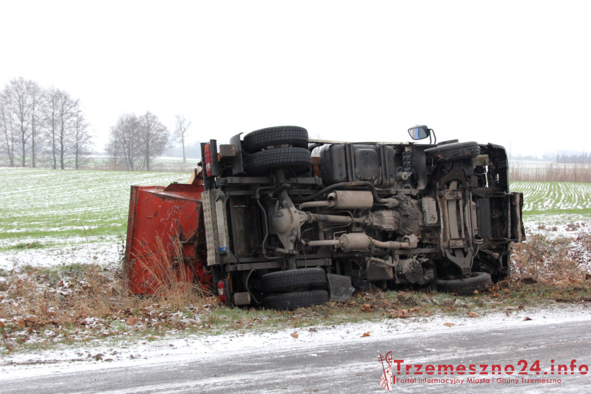 Około godziny 12:30 samochód ciężarowy wpadł w poślizg, po czym znalazł się w przydrożnym rowie. Na skutek zdarzenia nastąpił wyciek paliwa, interweniowali trzemeszeńscy strażacy.