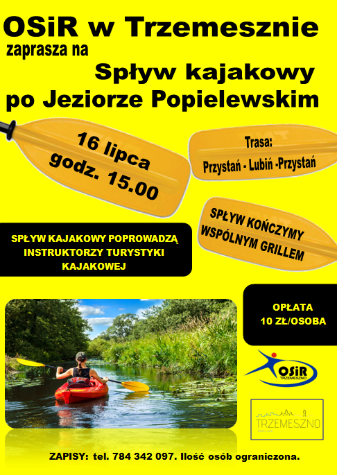Ośrodek Sportu i Rekreacji w Trzemesznie zaprasza wszystkich do udziału w spływie kajakowym po jeziorze Popielewskim, prowadzonym przez instruktorów turystyki kajakowej. Rozpocznie się on 16 lipca (niedziela) o godzinie 15:00 przy rybakówce.