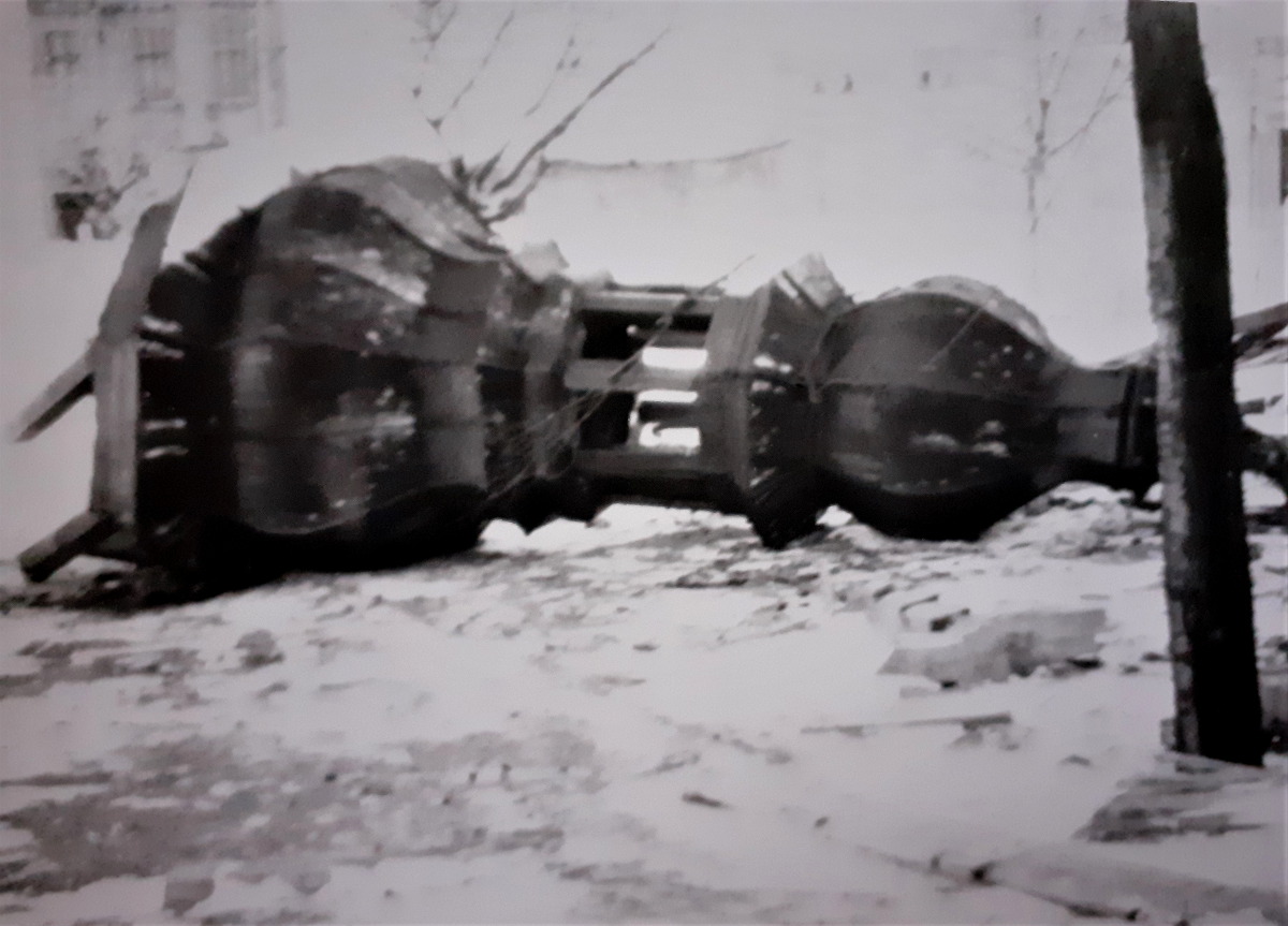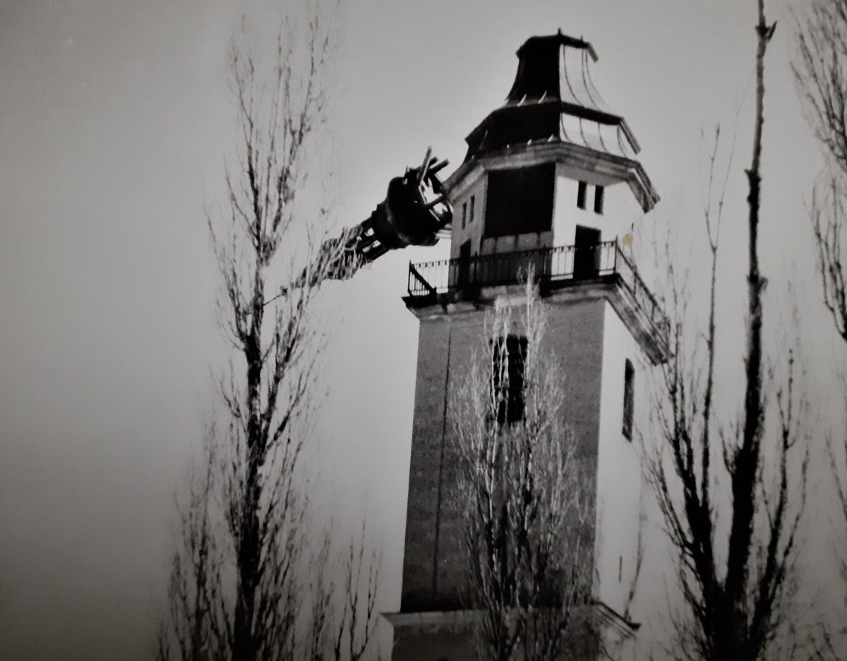 Obserwował również samą rozbiórkę. Uchwycił między innymi moment zrzucenia hełmu kościelnej wieży. Jak widać na jednym ze zdjęć, będąc u góry wykonał swego rodzaju selfie, wykorzystując prawdopodobnie funkcję samowyzwalacza.