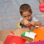 Na koniec dzieci wspólnie stworzyły pracę nawiązującą do tematyki morskiej. Na imitującej morze niebieskiej folii naklejały wycięte przez siebie ryby, statki itp. Wszystko działo się pod fachowym okiem instruktorów Domu Kultury.