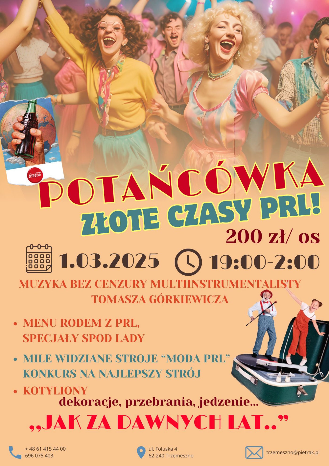 Zapraszamy serdecznie na niezapomnianą Potańcówkę w klimacie PRL, która odbędzie się 1 marca! Czeka nas wieczór pełen tańca, muzyki i smakołyków z tamtych lat.