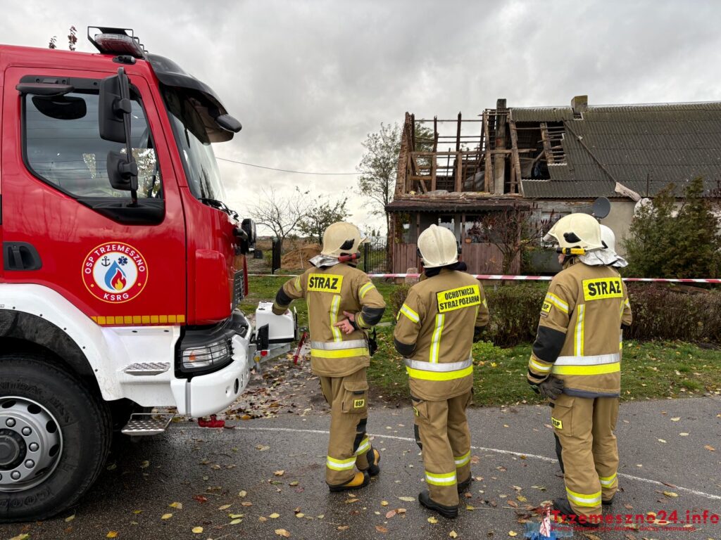 Na miejsce skierowano zastępy z OSP w Trzemesznie i JRG w Gnieźnie (drabinę), a także pogotowie energetyczne. Szkody okazały się bardzo duże. Wiatr zerwał dach z połowy domu, uszkodził także linię energetyczną oraz ogrodzenie. Fragmenty belek wylądowały na oddalonych o około 50 metrów torach kolejowych. Przydomowa trampolina przemieściła się o ponad 200 metrów, widoczna jest na ostatnim ze zdjęć. Na szczęście nikt nie odniósł obrażeń.