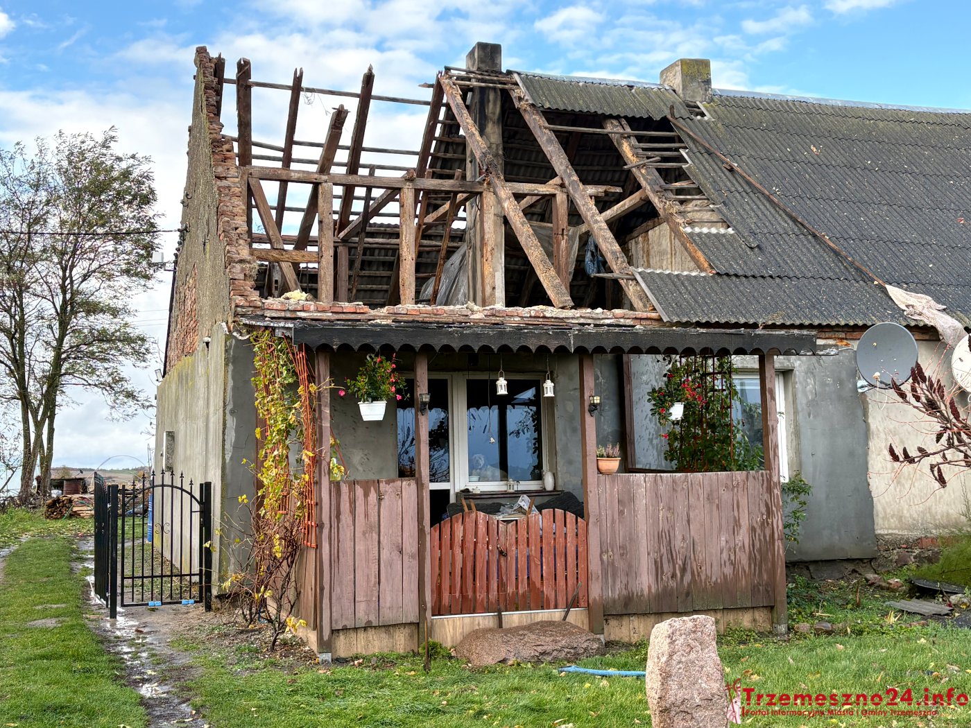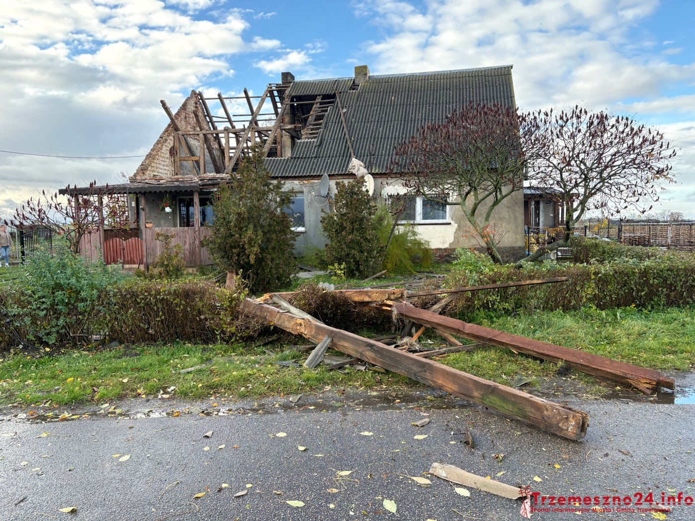 Na miejsce skierowano zastępy z OSP w Trzemesznie i JRG w Gnieźnie (drabinę), a także pogotowie energetyczne. Szkody okazały się bardzo duże. Wiatr zerwał dach z połowy domu, uszkodził także linię energetyczną oraz ogrodzenie. Fragmenty belek wylądowały na oddalonych o około 50 metrów torach kolejowych. Przydomowa trampolina przemieściła się o ponad 200 metrów, widoczna jest na ostatnim ze zdjęć. Na szczęście nikt nie odniósł obrażeń.
