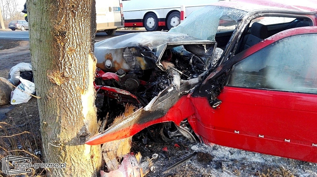 Dzisiaj, około godziny 14:30, na drodze krajowej nr 15 pomiędzy Trzemesznem i Gnieznem doszło do groźnie wyglądającego wypadku. W Lulkowie samochód osobowy marki BMW uderzył w przydrożne drzewo. Auto zaczęło się palić.