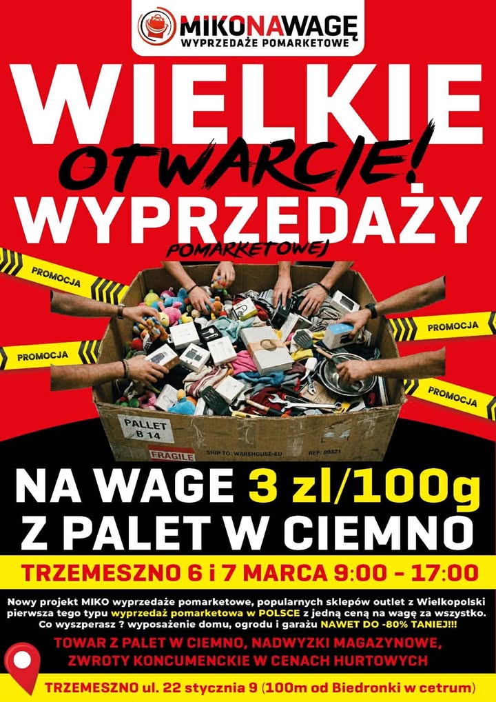 Już 6 i 7 marca w Trzemesznie odbędzie się nietypowa wyprzedaż pomarketowa, podczas której klienci zapłacą za wybrane produkty… według ich wagi. Wydarzenie zaplanowano w godzinach od 9:00 do 17:00, przy ulicy 22 Stycznia 9 (około 100 metrów od sklepu „Biedronka”).