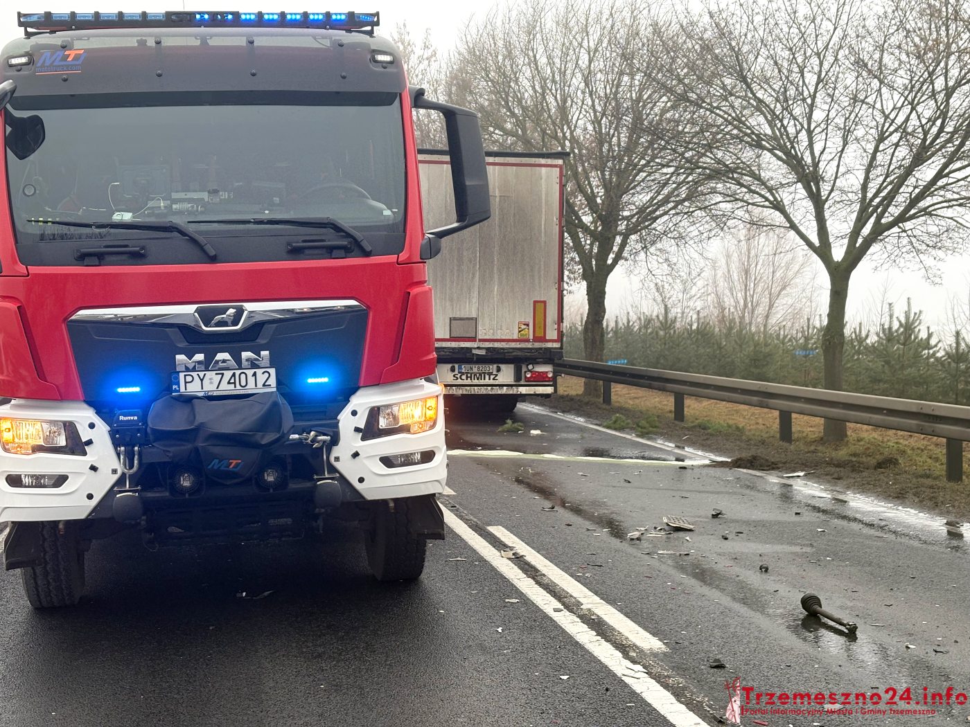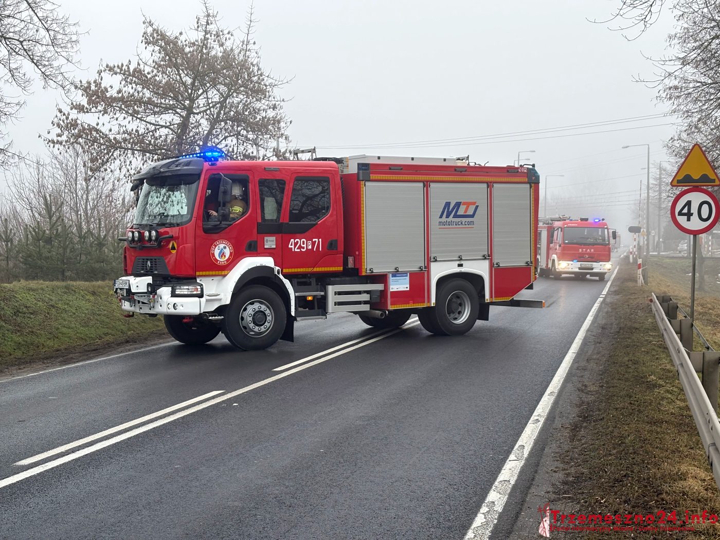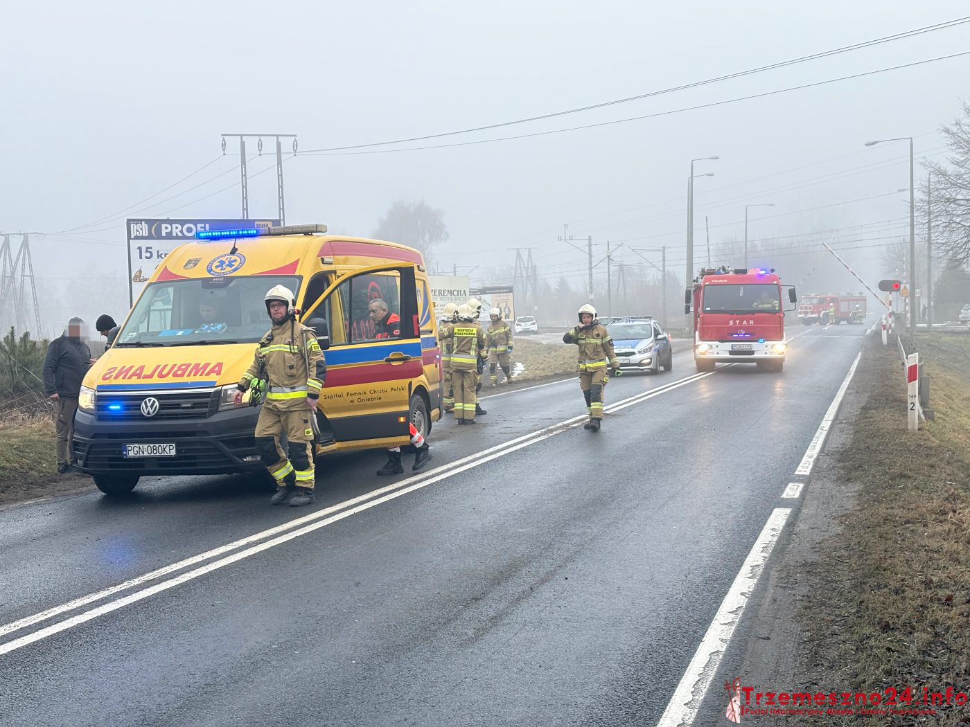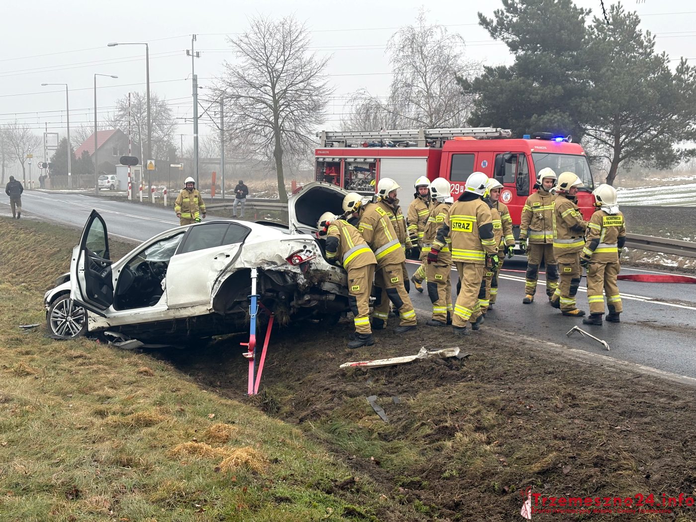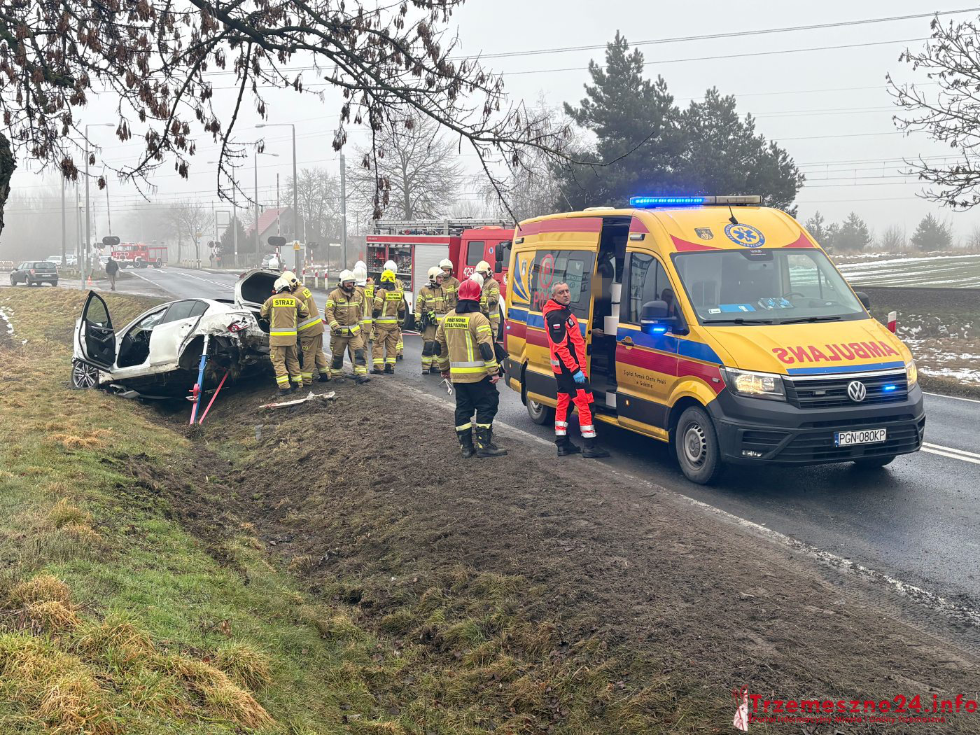 Na miejsce skierowano strażaków z Trzemeszna, Wymysłowa i Gniezna, pogotowie ratunkowe oraz policję. Jedna osoba, kierujący infinity, odniósł obrażenia ciała. Został przetransportowany do szpitala. Autem podróżowały dwie osoby, wszystkie wyszły na zewnątrz o własnych siłach.