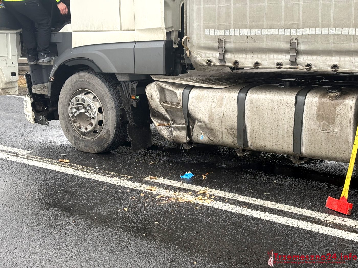 Z uwagi na uszkodzenie zbiornika w aucie ciężarowym, doszło do dużego wycieku paliwa. Jego neutralizacją zajęli się strażacy.